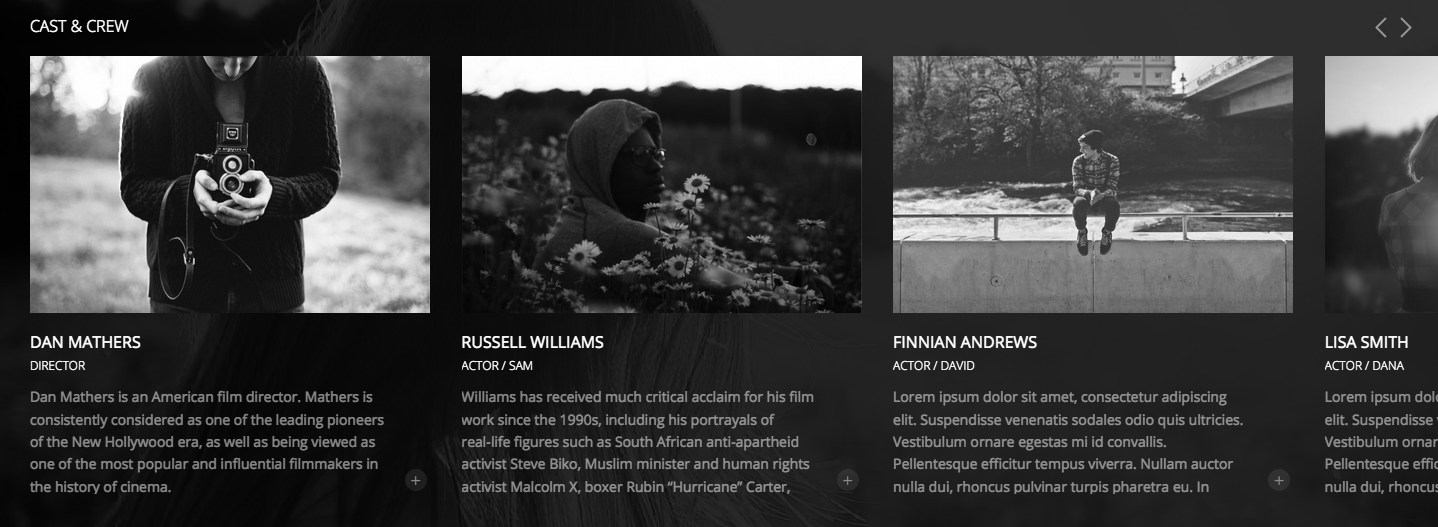 To control the footer credits at the bottom of the page, navigate to "appearance" > "customize" and open the "Footer" section. To create the "poster credits" style, simply use [SQUARE BRACKETS] to group text together and (round brackets) to make text small.