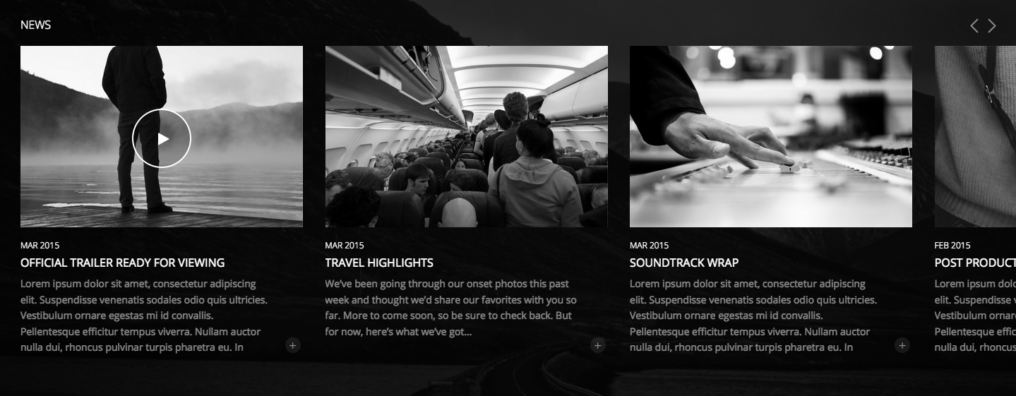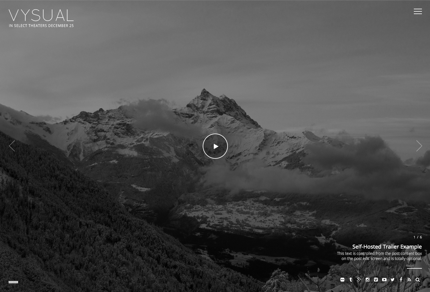 When using the "Videos Page" page template, the page displays a single video post with play button and title/content in the lower-right corner. There are arrow links to additional video posts. More info »