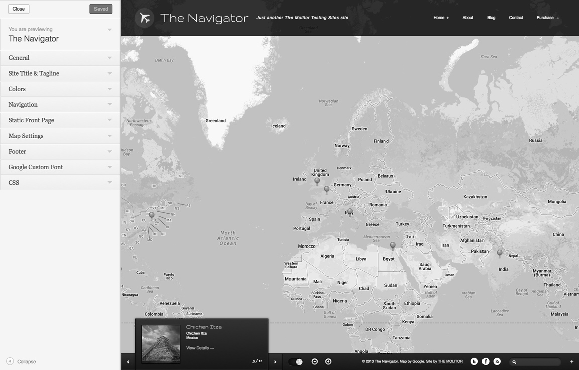 v2.2.8 - Jul 2016 * Added: support for new Google Maps API requirement. v2.2.7 - Oct 2015 * Fixed: search button option now accessible from the "general" section on Customize page. v2.2.6 - Oct 2015 * Updated: ZoomBox plugin. * Improved: Better gallery support for ZoomBox plugin. v2.2.5 - Jun 2015 * Added: ZoomBox lightbox plugin zip file to files folder (optional). * Removed: prettyPhoto lightbox plugin due to vulnerability. v 2.2.4 - Apr 2015 * Added support for WordPress 4.2 sidebar markup requirements * General code improvements. v 2.2.3 - Mar 2015 * General code improvements. v 2.2.2 - Aug 2014 * Improved custom post options code. * Fixed issue with submission form. v 2.2.1 - Apr 2014 * Fixed issue with accordion animation. v 2.2.0 - Apr 2014 * Added custom link option for posts on map * Added category option for home map v 2.1.0 - Mar 2014 * Added image upload option to front-end post submission form v 2.0.3 - Feb 2014 * Code improvements v 2.0.2 - Jan 2014 * Improved: responsive menu listing for child menu items * Fixed: Colors for some elements when using light theme skin v 2.0.1 - Dec 2013 * Fixed minor bug on single post page v 2.0.0 - Dec 2013 * Added: Responsive support. * Added: Retina ready support. * Added: Street View support. * Added: Welcome message option for home page. * Added: Light theme skin option. * Added: Full width page template. * Added: Font Awesome support. * Added: Menu search feature. * Added: Additional social icons. * Added: Zoom level option for home page. * Added: Sub category support for blog. * Updated: Design. * Updated: Post sharing options. * Updated: General Code optimizations/improvements. * Fixed: duplicate in .POT file v 1.7.4 - Nov 2013 * Fixed .POT file errors. v 1.7.3 - Nov 2013 * Fixed long/lat data usage for users updating from 1.6.1 and older. v 1.7.2 - Nov 2013 * Fixed Google Chrome loading issue. v 1.7.1 - Nov 2013 * Added: lat/long option (not required) * Fixed: minor background bug in page.php v 1.7.0 - Nov 2013 * Added: Front-end post submission form with validation and email notice * Added: Google zoom controls on map (replaces previous zoom buttons). * Added: Scroll wheel and double-click to zoom support * Improved: lat/long automatically generated based on address * Improved: Google custom font API link no longer required * Improved: general code improvements v 1.6.1 - Oct 2013 * Minor bug fixes and improved map listing performance. v 1.6.0 - Sept 2013 * Updated: added theme customizer support (removed OptionTree system). v 1.5.2 - Aug 2013 * Fixed: marker labels appearing by default. v 1.5.1 - Jul 2013 * Fixed: duplicates in POT file. v 1.5.0 - Feb 2013 * Added: Theme localization support. v 1.4.4 - Feb 2013 * Updated: Theme options panel. v 1.4.3 - Dec 2012 * Updated: jQuery UI to version 1.9.2. v 1.4.2 - Dec 2012 * Added: captions to lightbox pop-up. v 1.4.1 - Nov 2012 * Updated: theme options panel appearance and updated/added support tab. v 1.4.0 - Aug 2012 * Added: built-in OptionTree system. Plugin no longer required. * Fixed: dropdown menus on iOS devices. * Improved: general code improvements/optimizations. v 1.3.0 - Aug 2011 * Added: Custom marker option (site wide & individually). * Fixed: Twitter sharing username issue. * Fixed: Custom toggle hover effect color. v 1.2.0 - Aug 2011 * Fixed: Reported issue with iPad. v 1.1.0 - Aug 2011 * Fixed: Reported issue with menu spacing.