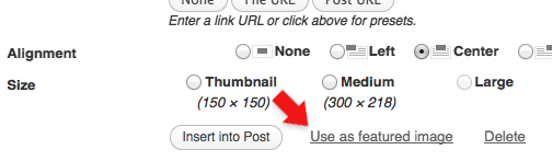 To feature images, use the “Featured Image” section on the lower right side of the post edit page (see screenshot below). After uploading the image, select "Use as featured image". When uploading an image, it automatically creates all the different sizes for you. For reference: images for blog posts are 500x200 and images for map items are 95x95.