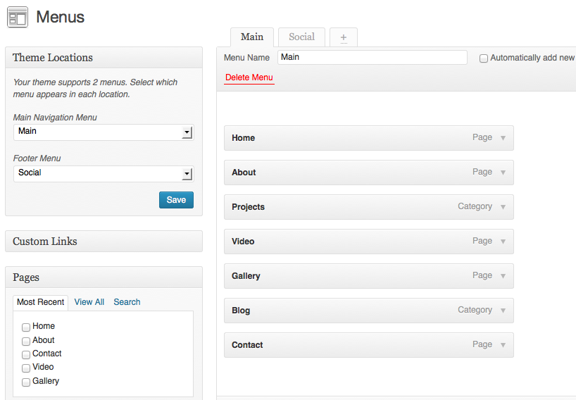 NOTE: Only pages and categories are supported for the main menu. Also, sub menus are not support for the main menu.