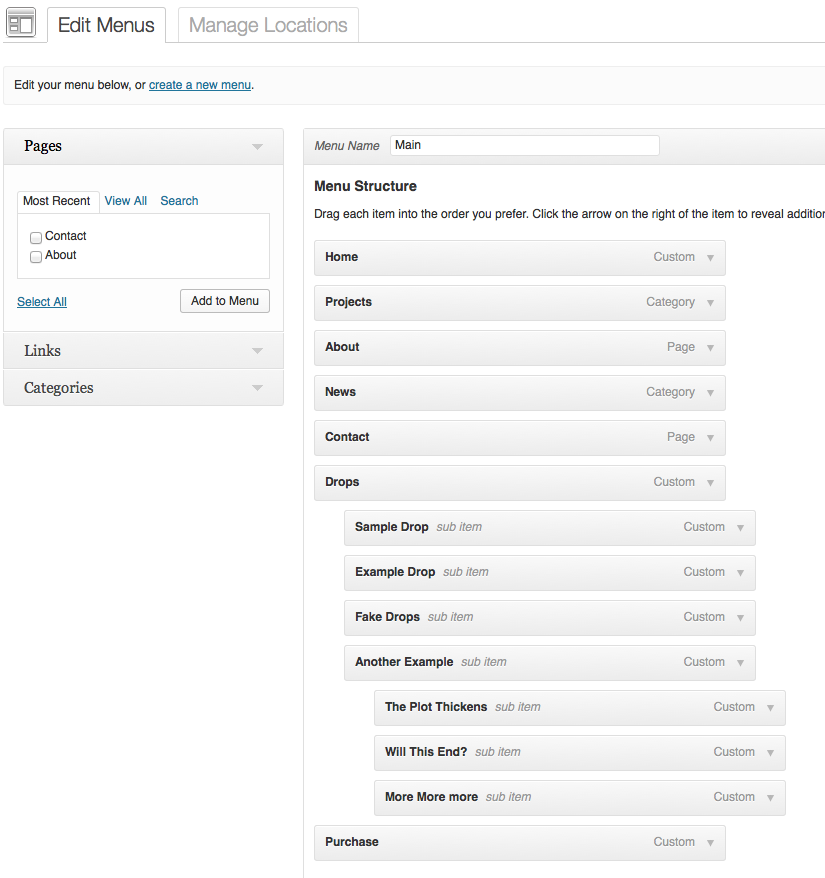 To organize your menu tabs, navigate to “Appearance” > “Menus”. For more information and instruction, watch the theme setup video here: http://www.youtube.com/user/themolitor/videos.