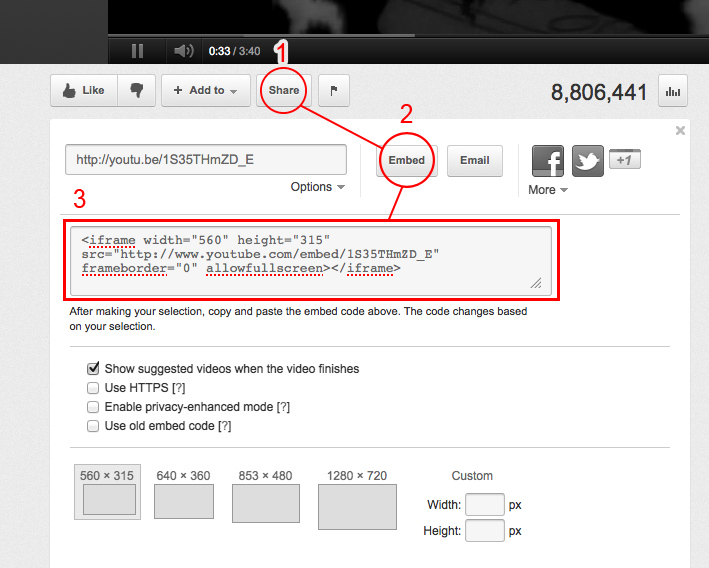 To assign a video as the main video for a post, use the "Main Video Embed Code" field on the post edit screen (see screenshot below). Review the below screenshots for where you can find these embed codes on sites like Vimeo and YouTube. You can also embed videos into the main content area of a post/page by pasting the embed code into the post content box. In these situations, when you're dealing with raw code, make sure you're using the "HTML" tab (not the "visual" tab) on the WordPress page/post edit screen.