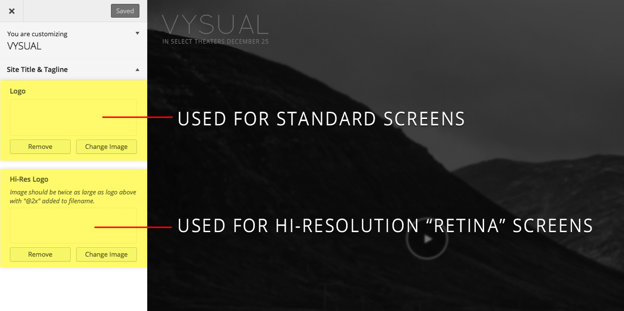 The logo is controlled from the "Site Title" section of the Customzie page. There are two logos needed for the different types of screens currently out there. The hi-res version should be two times (2x) the size of the standard logo with "@2x" appended to the name.