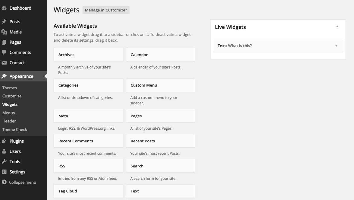All widgets are controlled from the "widgets" page (under "appearance"). The “Live Widgets” section controls the main widgets panel.