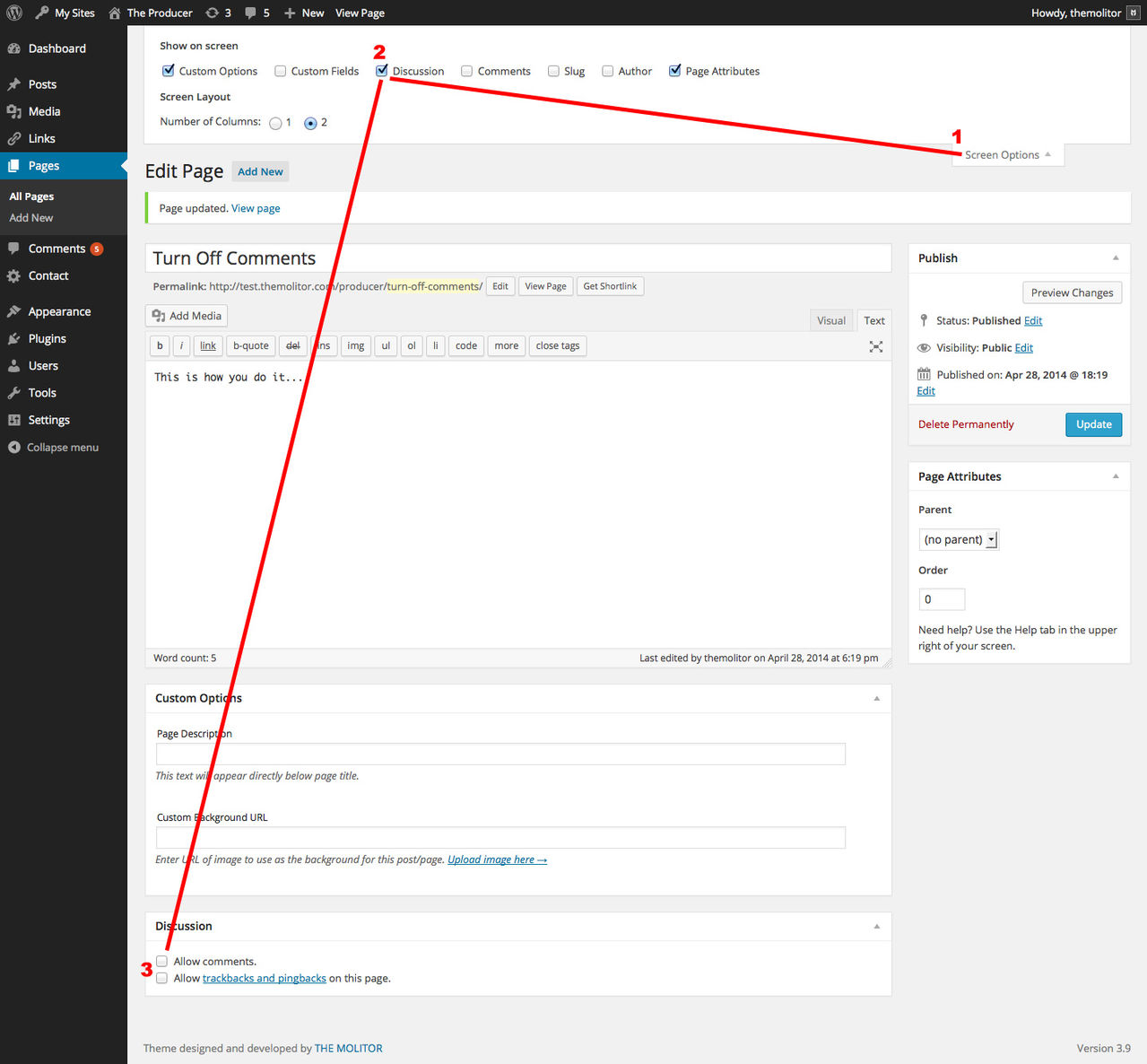 To turn off comments for a specific post/page, check/uncheck the box in the discussion panel on the post/page edit screen (step #3 below). If you don't see this dialogue box, you can turn it on by clicking "screen options" (#1) and checking the box to display discussion options (#2)...
