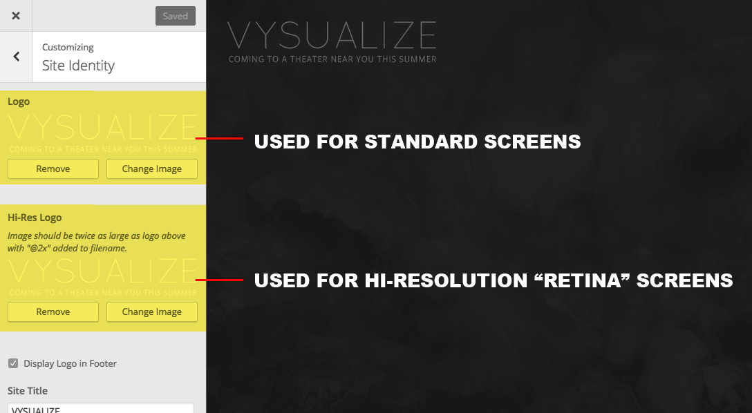 The logo is controlled from the "Site Identity" section of the Customzie page. There are two logos needed for the different types of screens currently out there. The hi-res version should be two times (2x) the size of the standard logo with "@2x" appended to the name.
