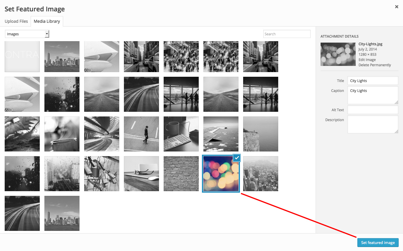 To feature images, use the “Featured Image” section on the lower right side of the post edit page (see screenshot below). After uploading the image, select "Set Featured Image". When uploading an image, it automatically creates all the different sizes for you.
