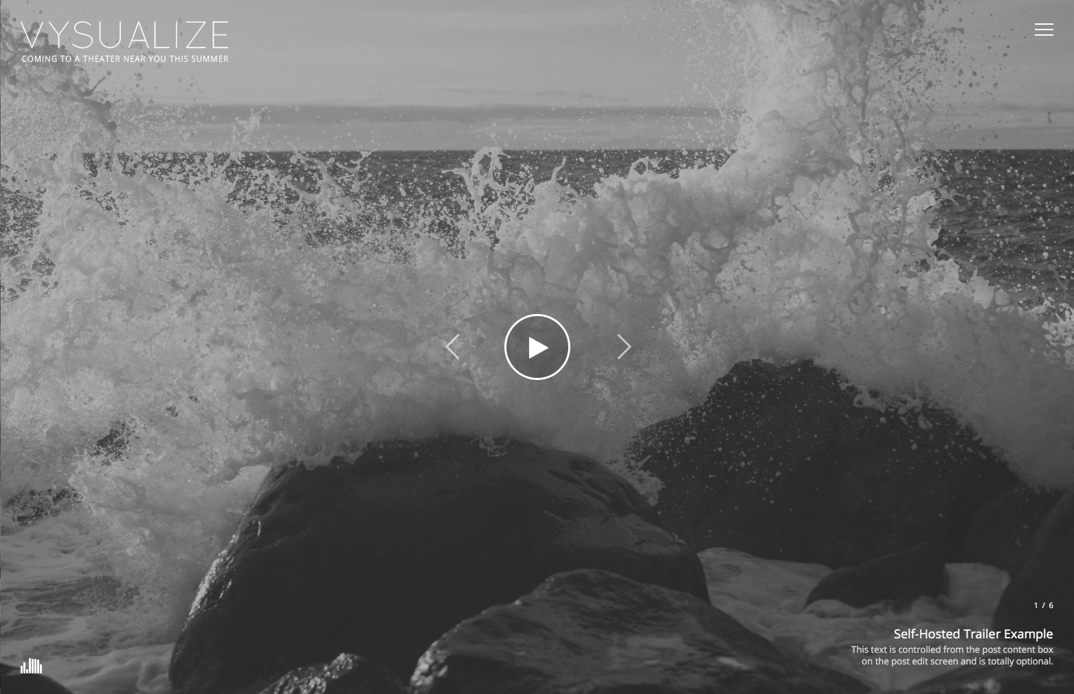 When using the "Videos Page" page template, the page displays a single video post with play button and title/content in the lower-right corner. There are arrow links to additional video posts. More info »